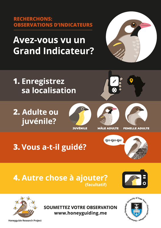 Vos observations sont très précieuses pour nos recherches sur l'écologie et l'évolution de la relation entre l'Indicateur et les humains. Voir À propos du projet pour plus d'informations sur le Projet de recherche sur les Indicateurs de l'Université du Cap.